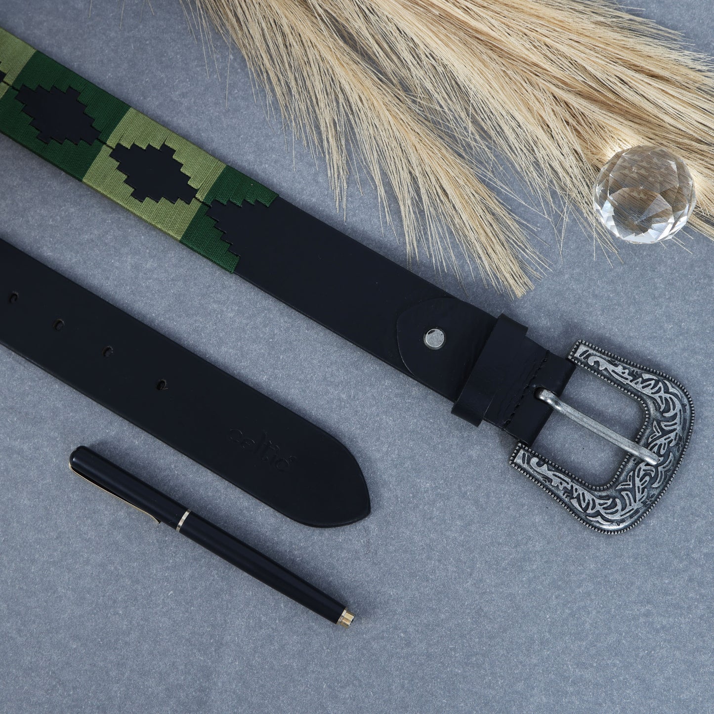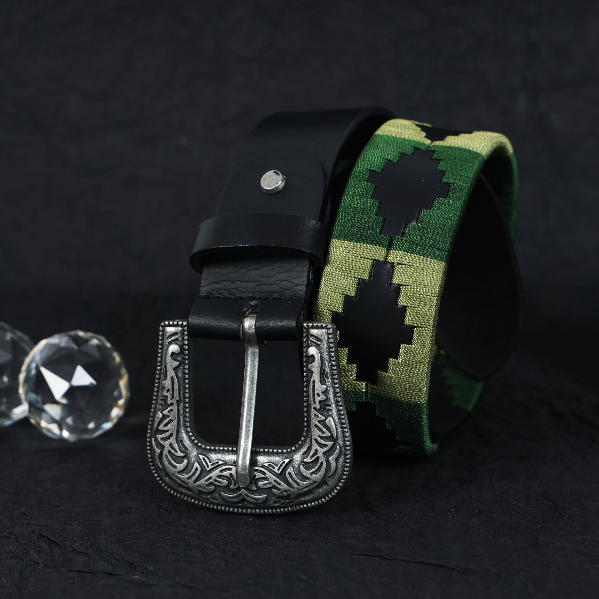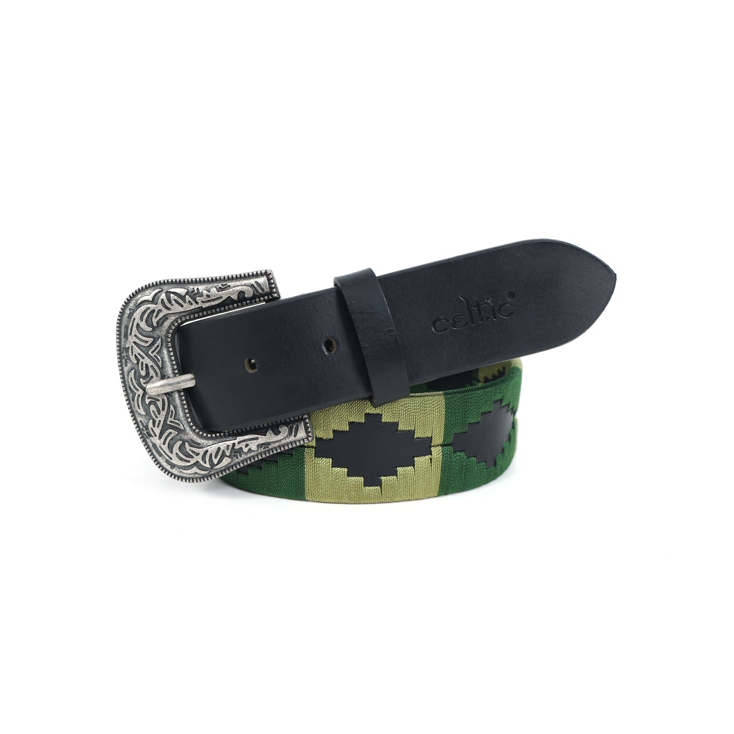 Elevate your style with the Celtic designer black leather polo belt, featuring striking green webbing and a premium designer buckle. Crafted for elegance and durability, this premium belt comes with a matching keyring for a refined finishing touch.