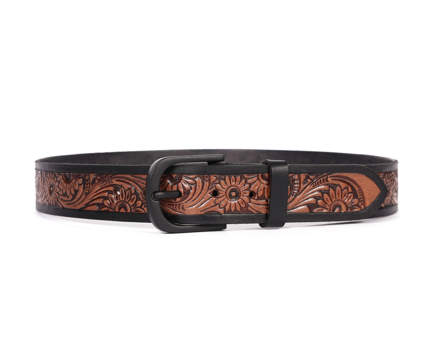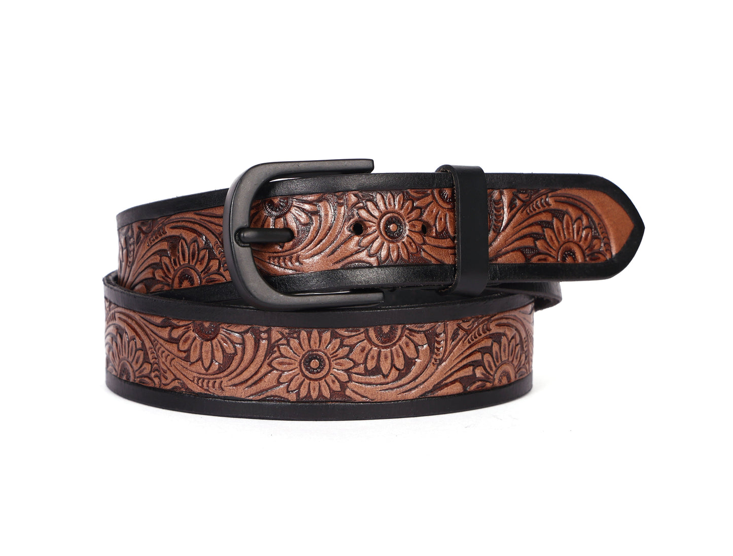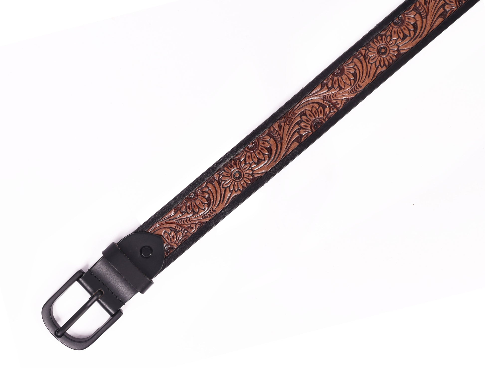 Exquisite Hand-Carved Leather Belt with Black Buckle, Crafted in India, Art: LB-804