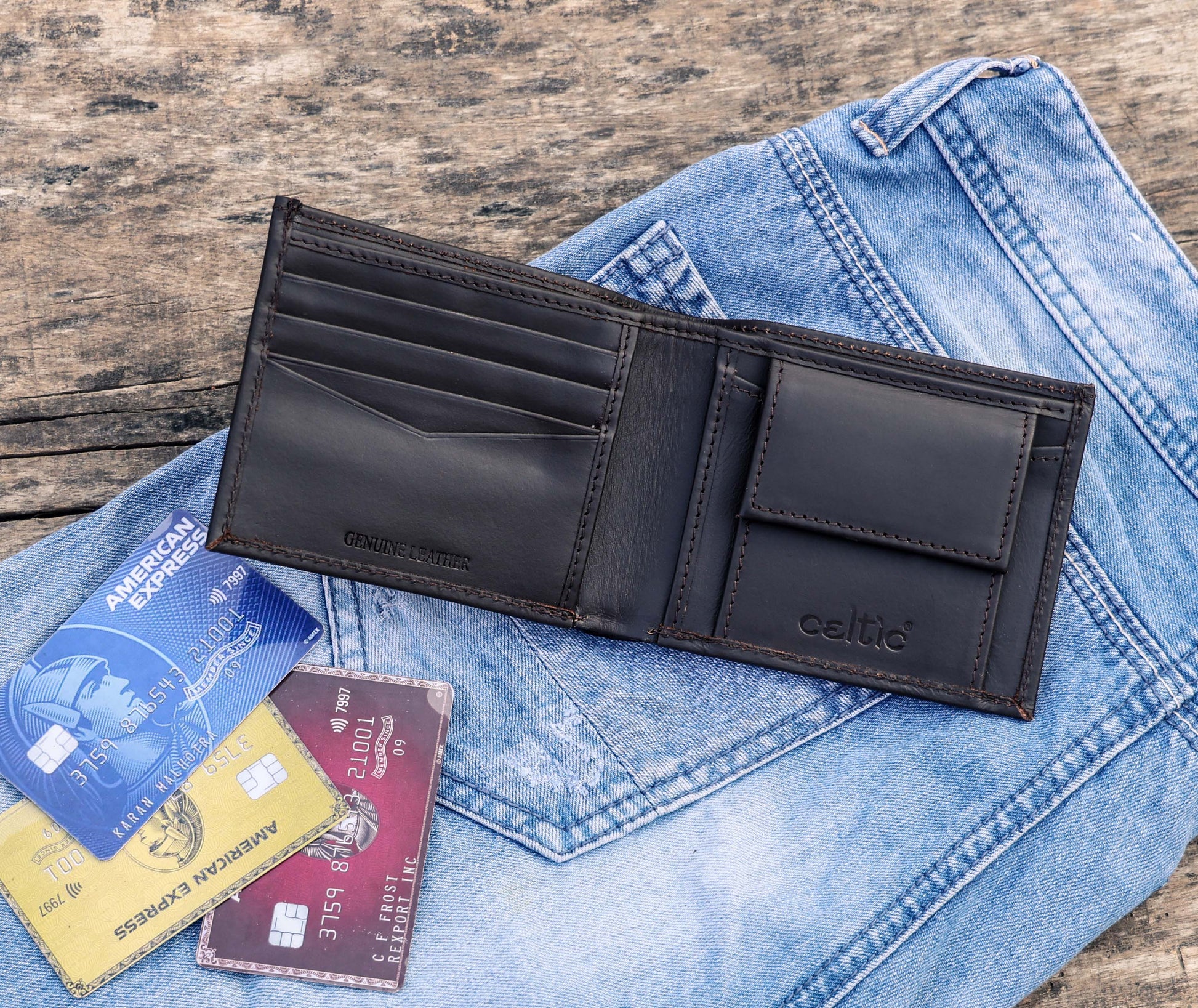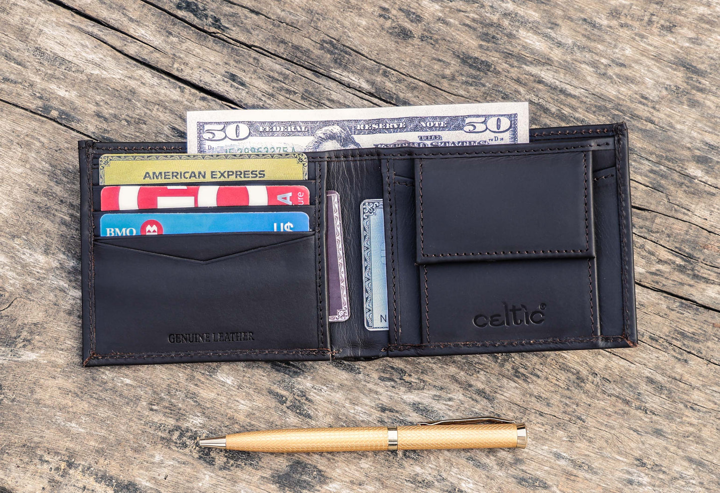 Meticulously crafted from high-quality leather, this wallet marries style and function seamlessly.